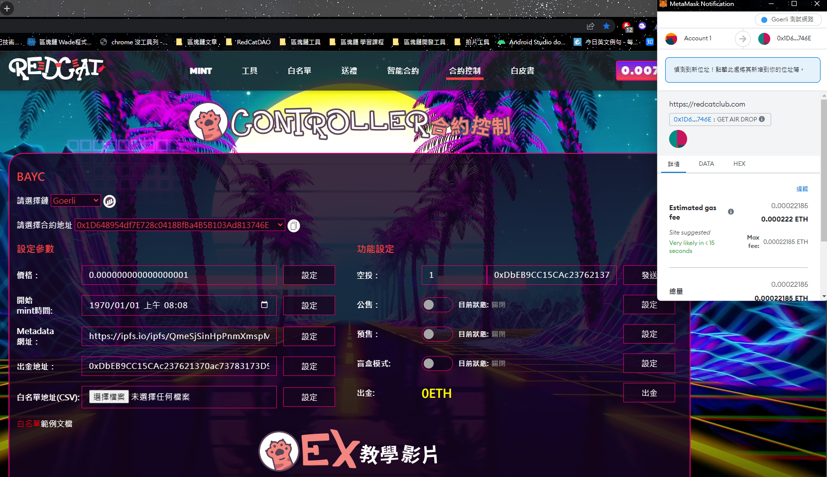 **每一個功能都只能使用那一欄位的按紐，只要資訊填好後點擊就會幫你跳出 MetaMask，記得要使用創建智能合約的地址，因為這些都只有 Owner 可以做設定。**